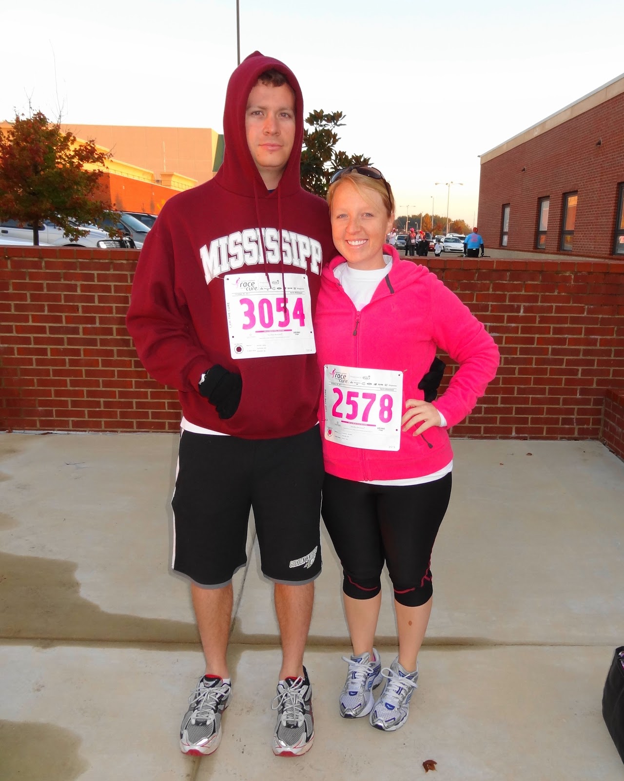 For the past few weeks we have been quite busy. It is starting to get chilly here in Starkville(finally) and we have enjoyed the cooling down of the temperature. It is a nice break from about 5 months of 85+ degree weather! On October 29 we participated in the Race For the Cure in Tupelo. This was significant because it was our first 5k that we were every going to run but it is one that I have wanted to participate in for years. The Race for the Cure is dear to my heart because of the cause that it supports and the fact that I could actually participate in memory of the single most influential person in my life. As I get older I realize that the things I miss most about my mother are not only having her around for the big moments but for her wisdom and grace and also her sense of humor. I long to know more about her as a person and how she was at my age. As I say this I feel cheated out of all of the comfort and knowledge that I missed out on by not having her around. On the flip side, from tragedy comes triumph(bad cliche but is true) and I think I have become a very independent, grateful and resourceful young woman because of the circumstances I have experienced since I was13 years old. As I grow older I realize that can be proud of the woman that I have become/are becoming because I have pushed through the adversity and the sadness and came out happy in the end. I love my life and I am the happiest I have ever been. That is in fact because of the people who love me including Mike, the Arnold’s and my friends have all made me feel special and whole again and for that I am eternally grateful!