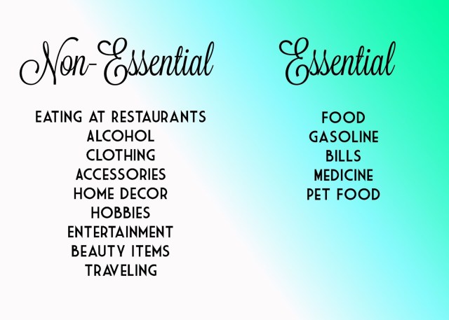 As for Mike and I, we will be participating in the challenge with a little modifications such as having a small budget set aside for a movie night(tickets only) as Divergent comes out in theaters and I am not willing to wait to see it. I know this goes against the plan but you cannot deprive yourself of everything or you will binge later and I plan to spend the money out of my personal fun money so that nothing leaves out joint account. So here is an outline of what we are considering as Essential and Non-Essential for us. Those things may mean different things to you but for us they mean exactly how ‘bare-bones’ can we live for the month. Also, by doing that we will appreciate all of the blessings we have and learn how to fully love what we already possess.