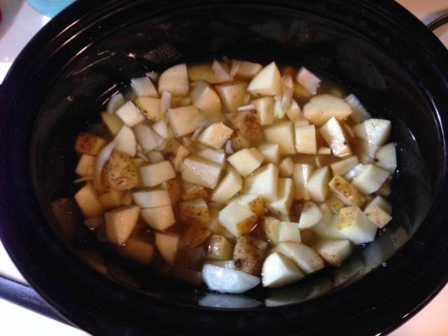 - Add onion, potatoes and 3/4 cup of water. Sprinkle ranch powder all over.