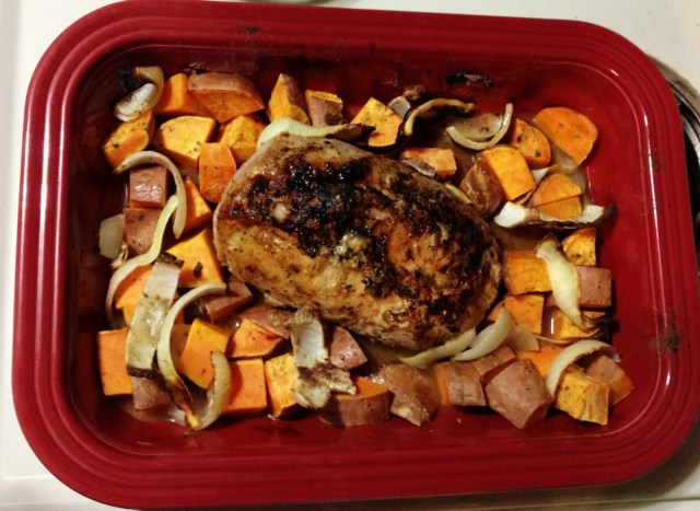 I wanted to try something a little different when I decided to whip up this easy pork loin roast last week. This recipe was seriously so easy and delicious. I love just throwing ingredients I have together and seeing what happens and this is exactly what I did! All you need is a 2-3 lb pork loin roast, two sweet potatoes, one large onion and some ranch powder to make a flavorful and easy weeknight dinner. I served mine with a side salad and a glass of red wine!